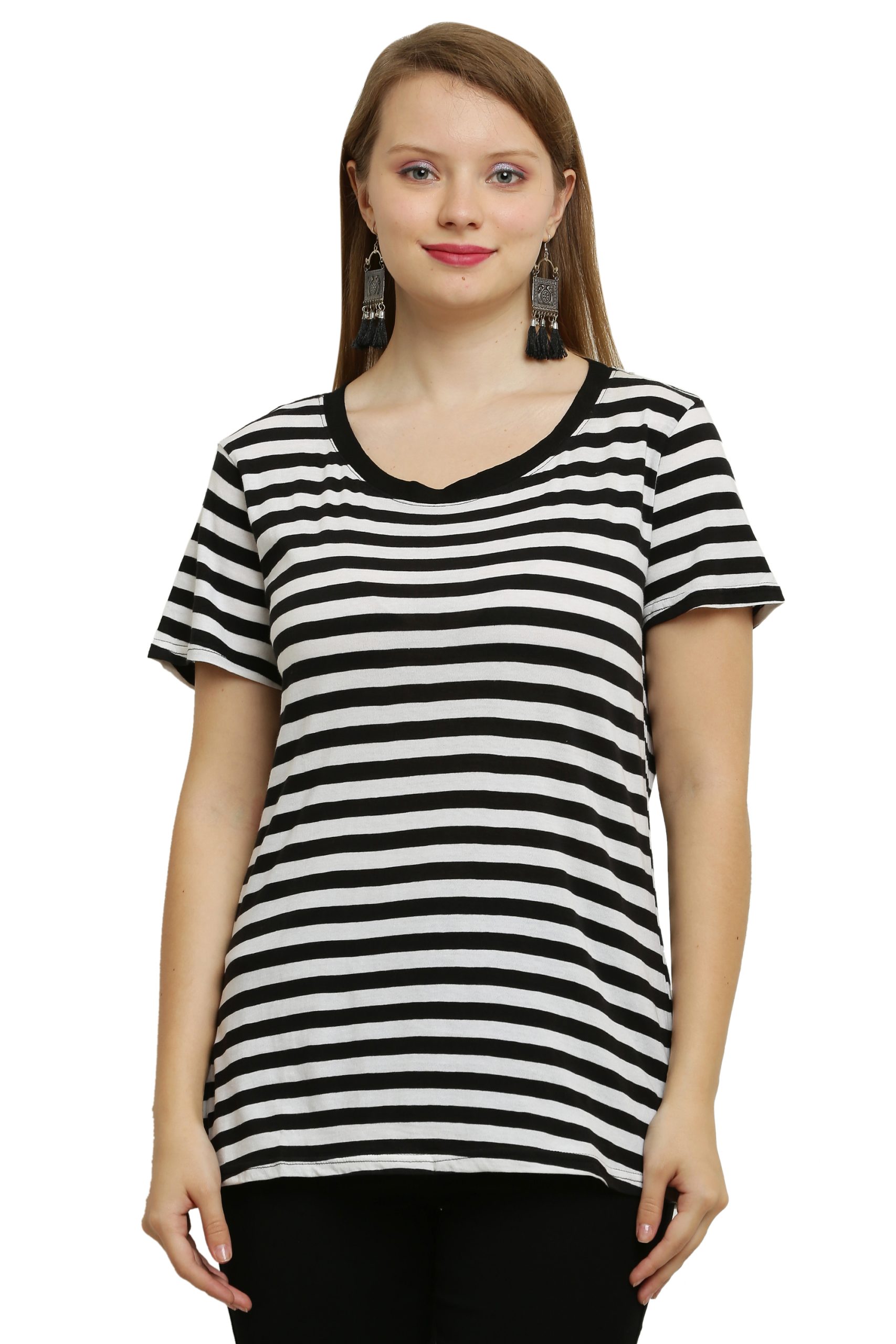 Women Striped Round Neck Pure Cotton Black, White T-Shirt